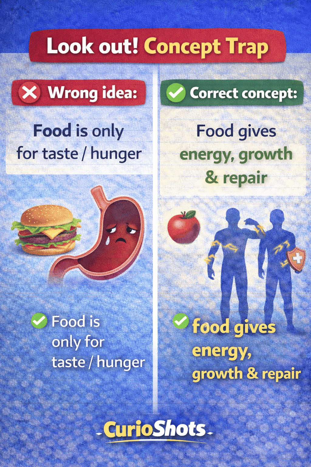 ❌ Wrong idea: Food is only for taste or hunger. ✅ Correct concept: Food gives energy, growth, and repair.
