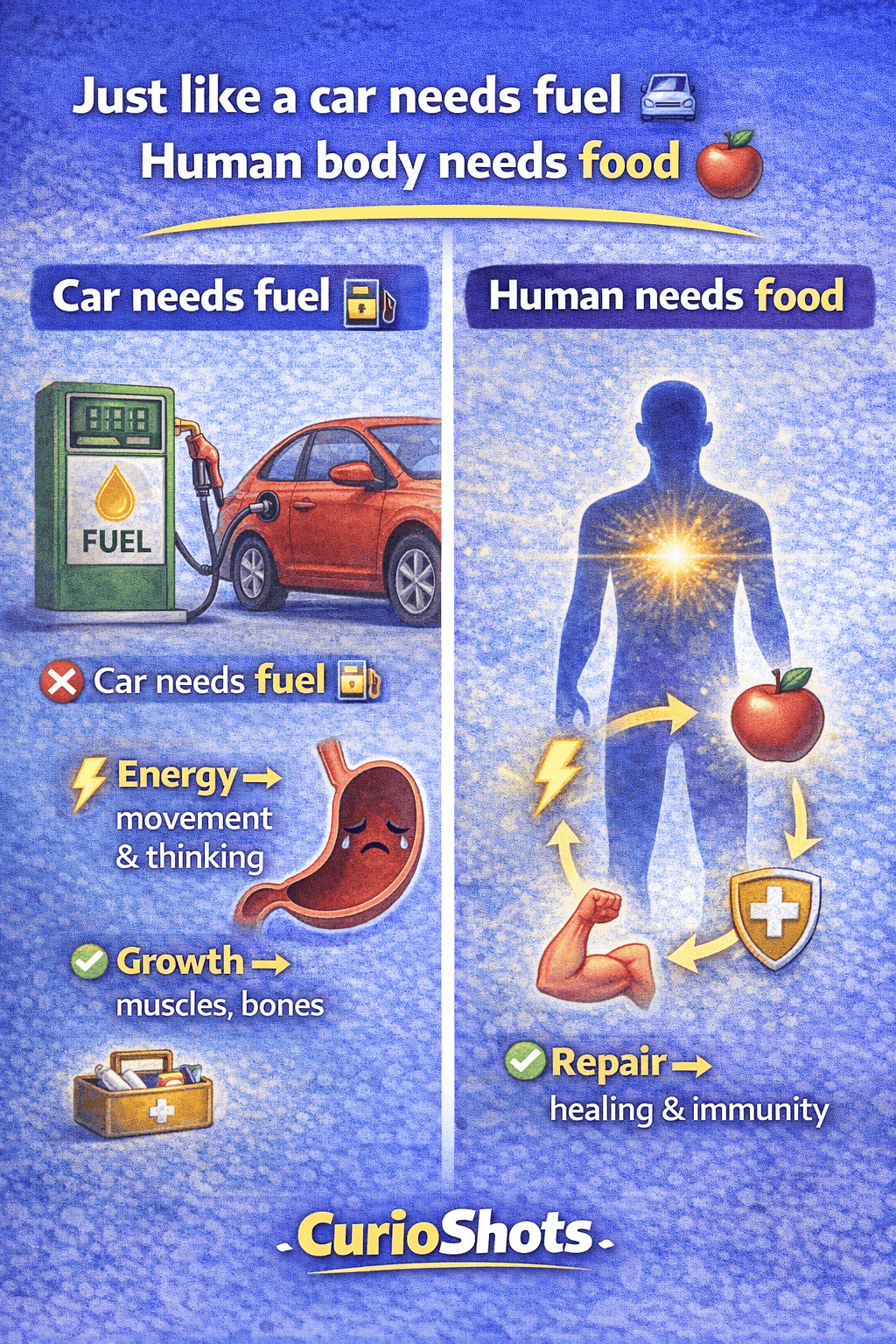 A car needs fuel to move. In the same way, the human body needs food to: Get energy, Grow muscles and bones, Repair damage and stay healthy