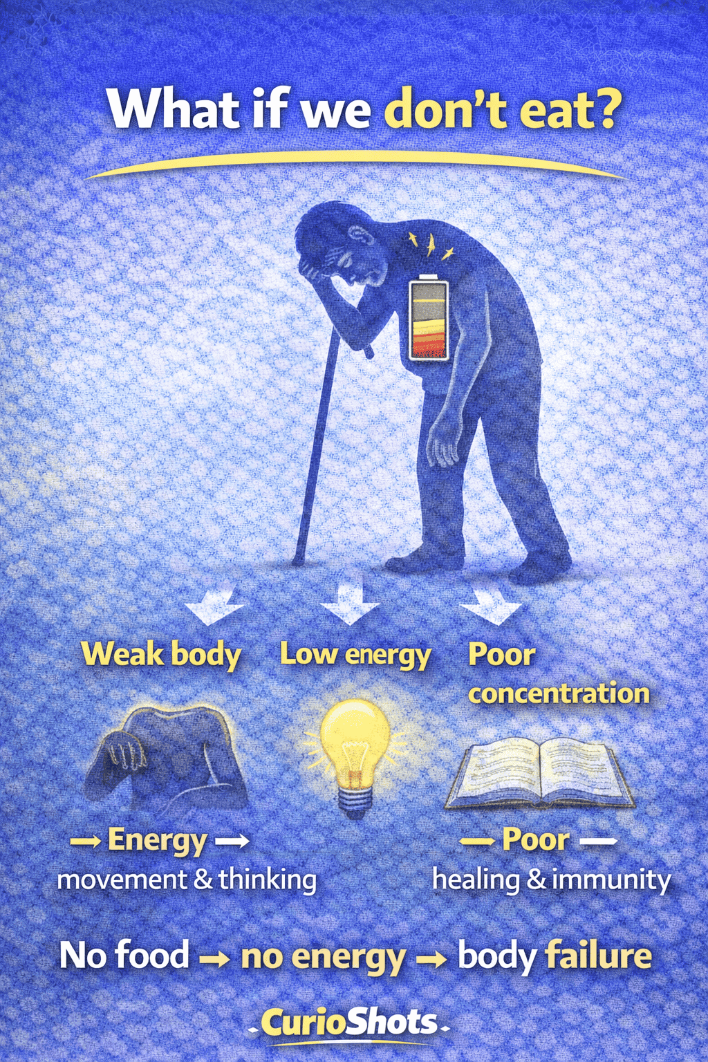Without food: Body becomes weak, Energy levels drop, Thinking and concentration reduce, Healing and immunity become poor. ???? No food → no energy → body failure