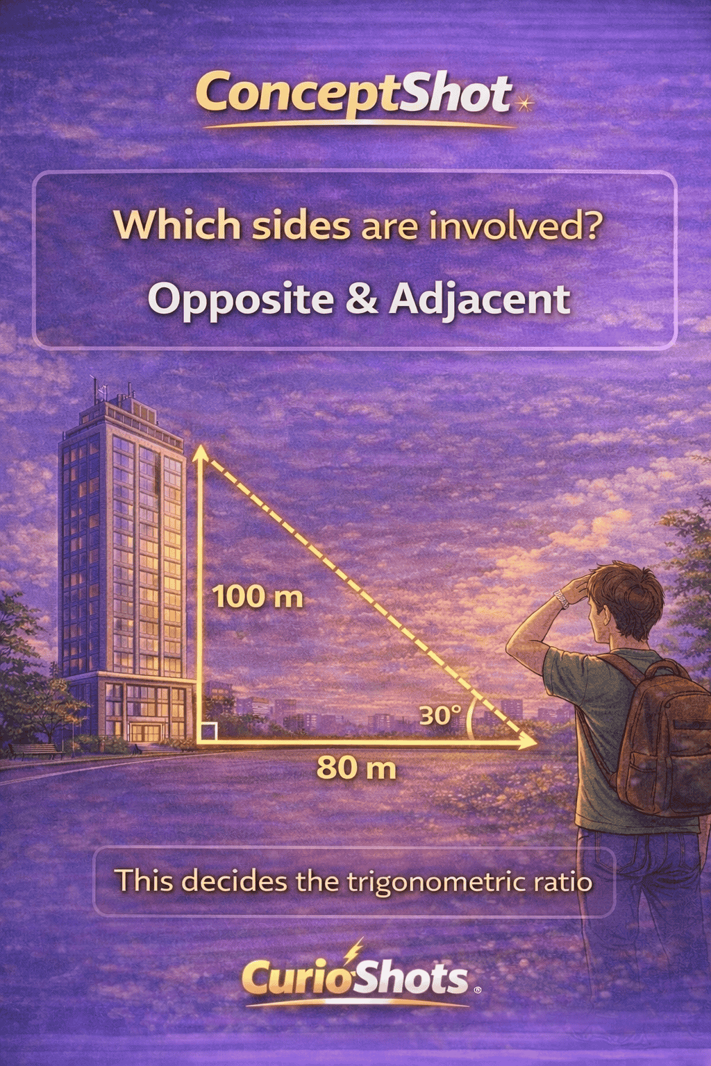 “Always imagine a right-angled triangle in heights and distances.” Explain verbally: Building = vertical side Distance on ground = horizontal side Line of sight = hypotenuse So: Height (opposite) = 100 m Distance (adjacent) = 80 m