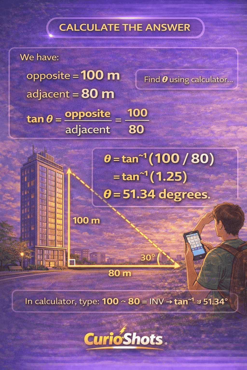 A building is 100 m tall and the observation point is 80 m away. We find the angle of elevation using tan theta and smart estimation.