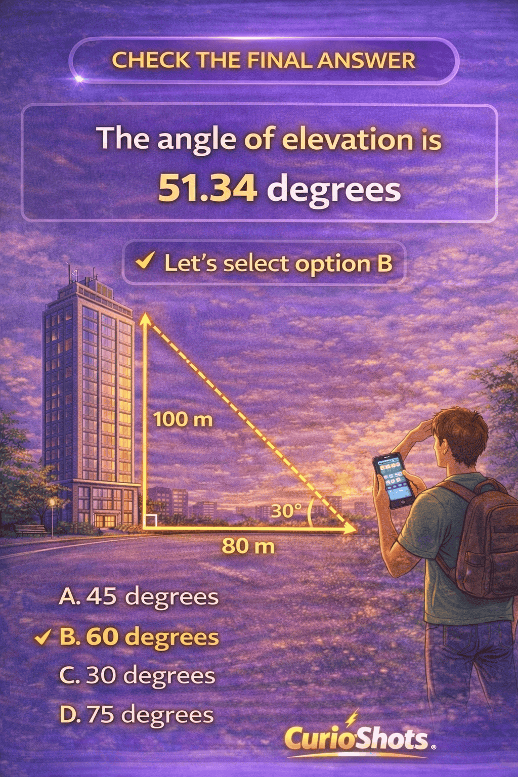 “Let’s carefully understand the problem first.” “A building is 100 meters tall.” Angle of elevation means the angle made with the ground while looking upward. “From a point 80 meters away from the base, we are looking at the top of the building.” “We are asked to find the angle of elevation.”