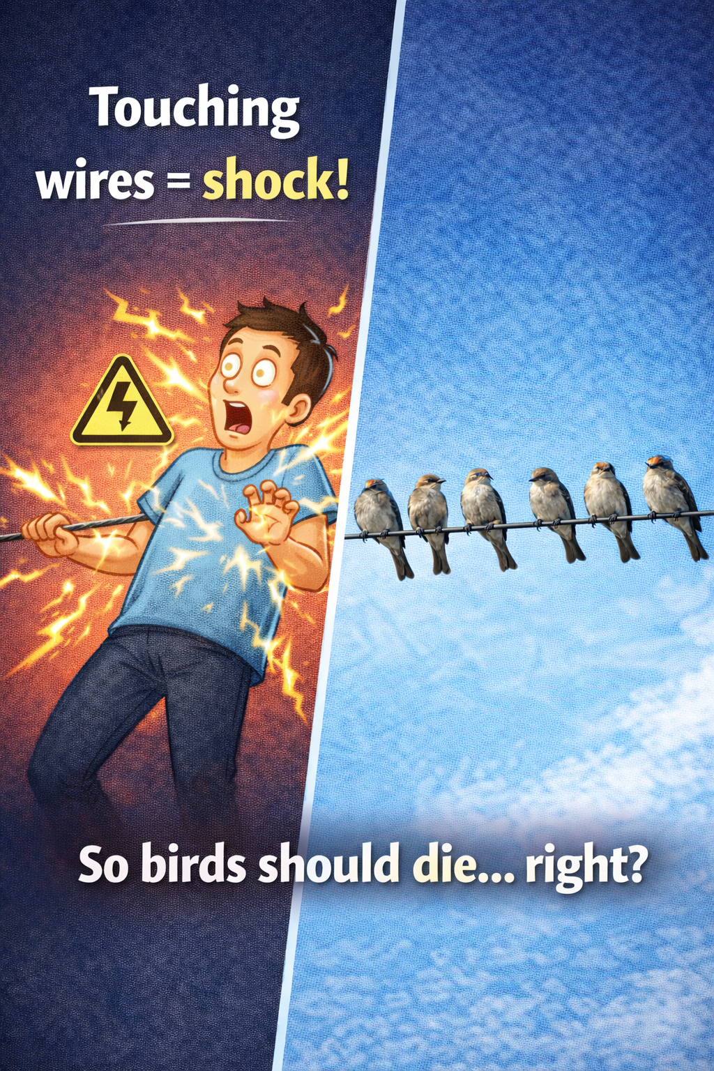 This looks puzzling because birds are in contact with the same wires that can harm us.