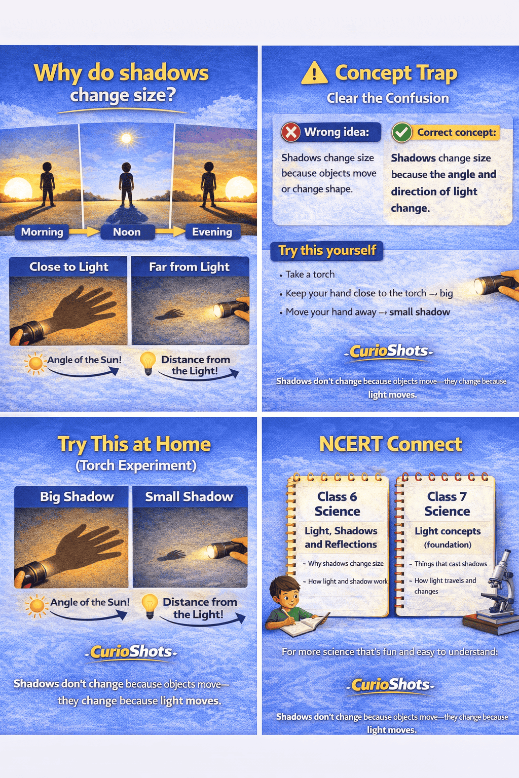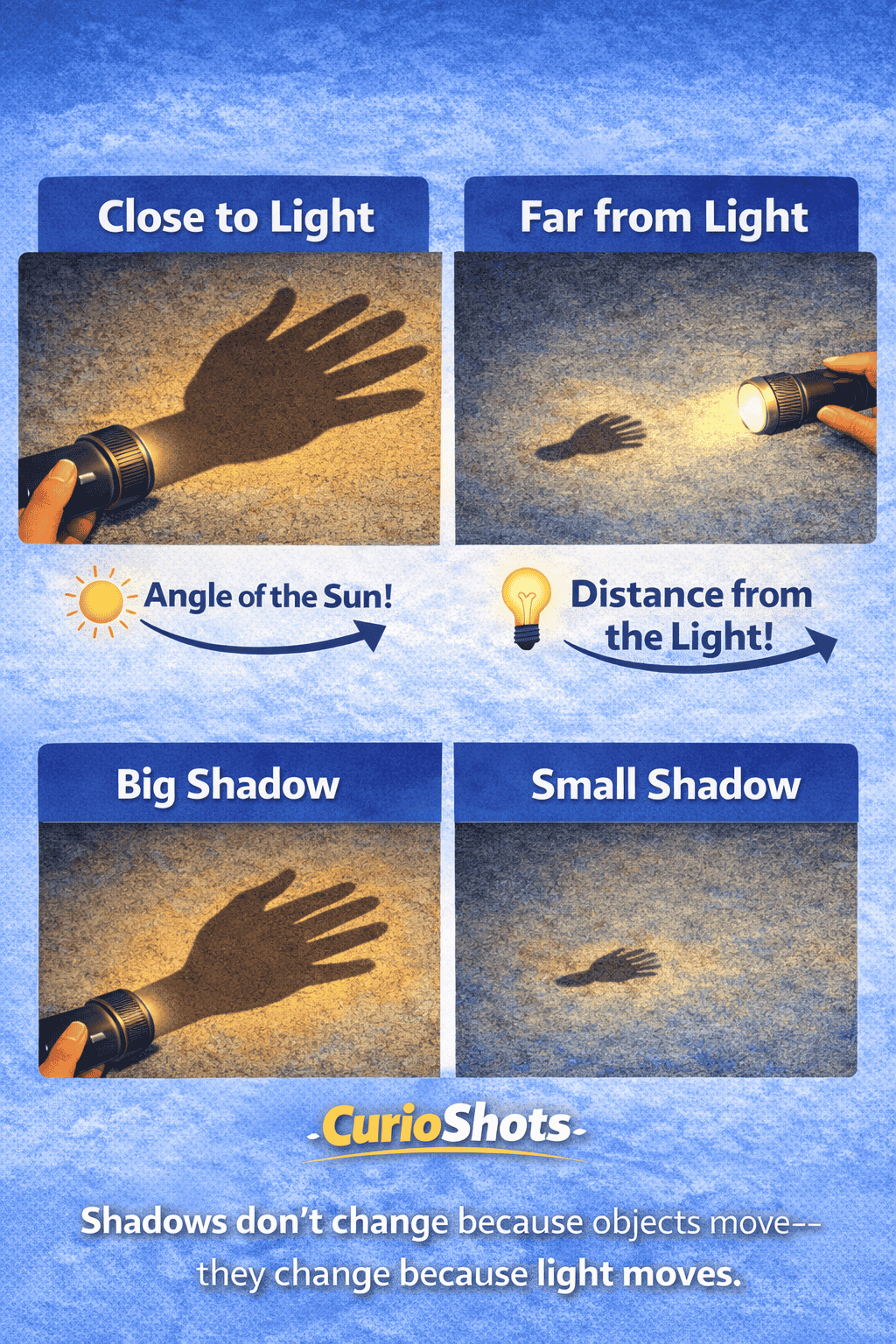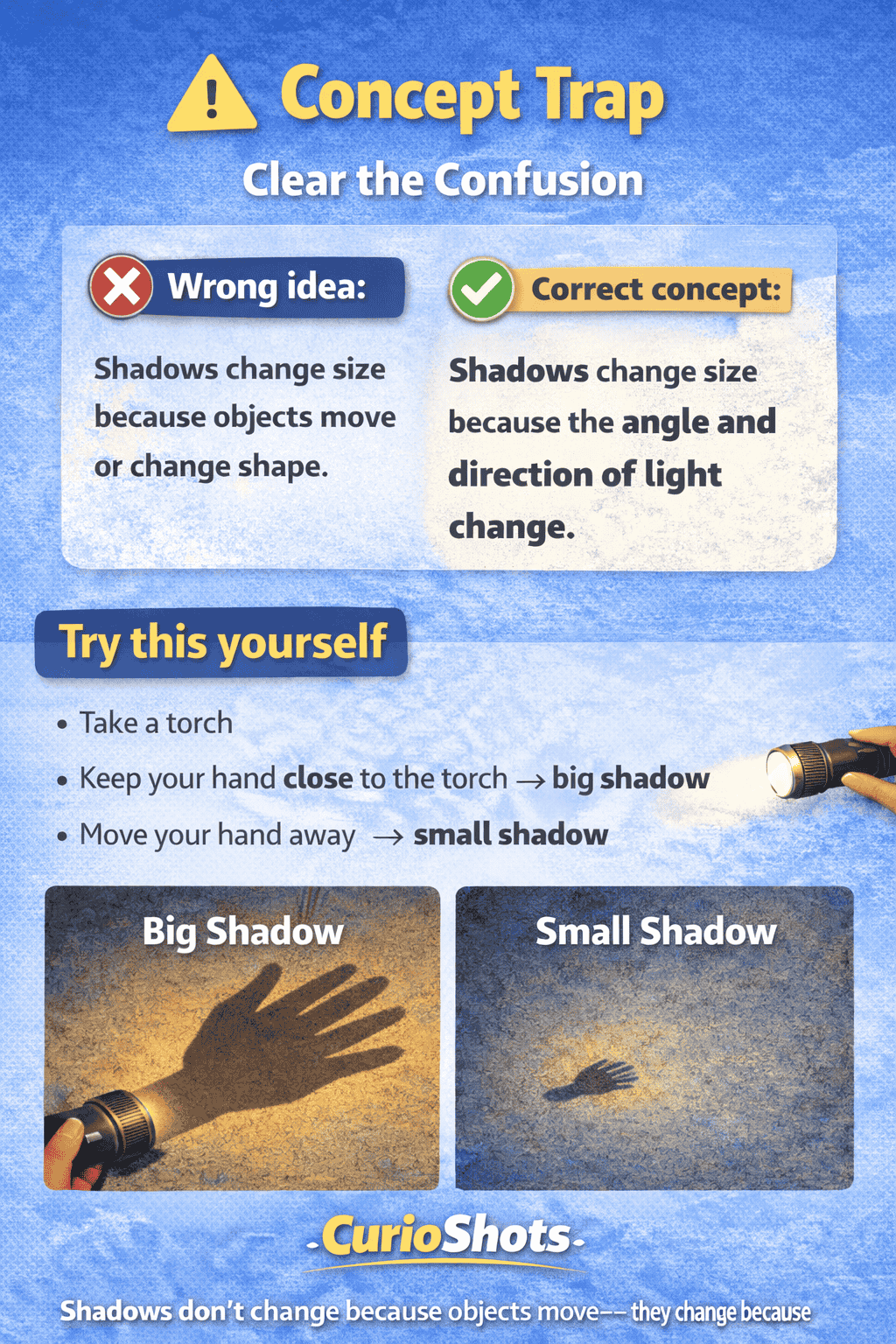 ❌ Wrong idea: Shadows change because objects change size. ✅ Correct idea: Shadows change because the angle and direction of light change.