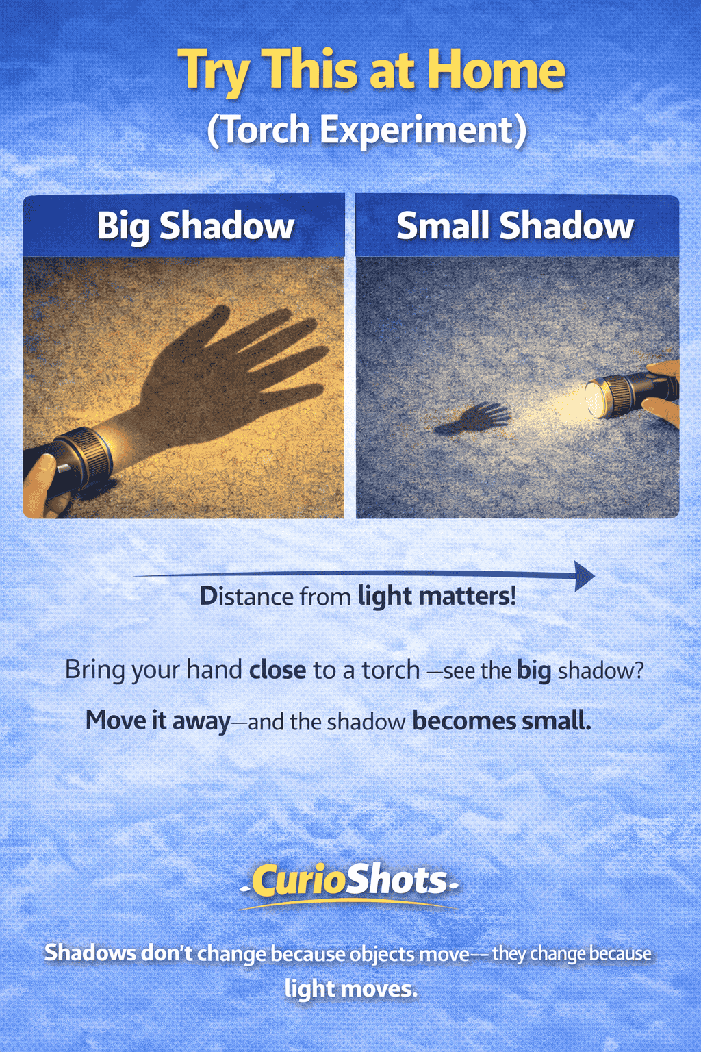Bring your hand close to a torch—see the big shadow? Move it away—and the shadow becomes small. Distance from light matters!